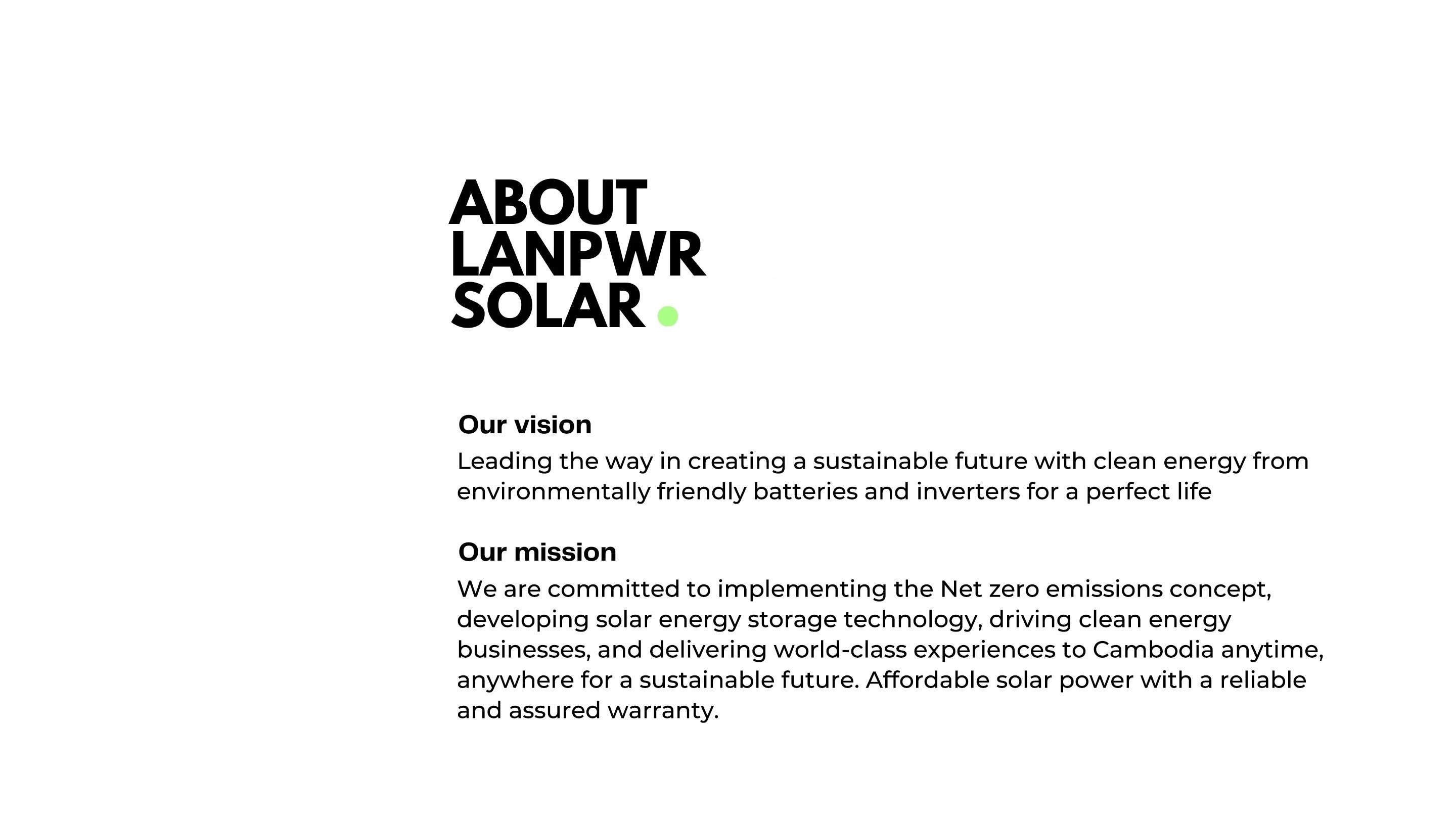 LANPWR Energy Technology (Cambodia) is one of the energy business operators in Cambodia to deliver sustainable energy and services to customers easily and privately. Our strategy is based on flexible energy generation and management models to accelerate our country's energy transition.